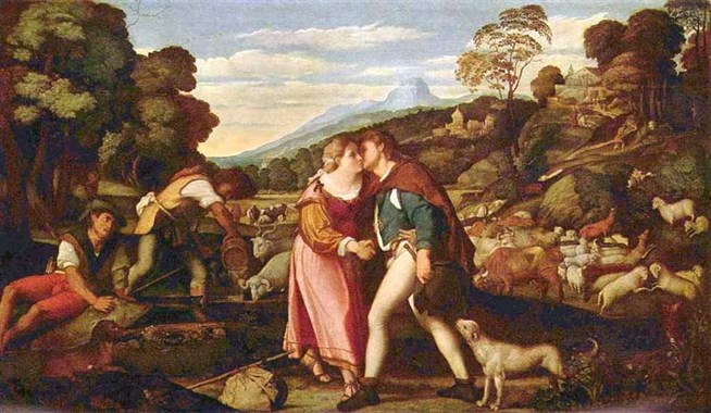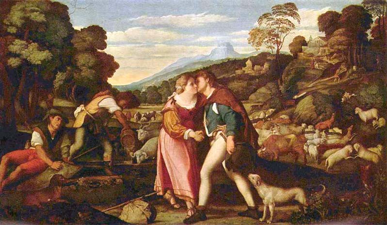 Якопо Пальма-старший. Иаков и Рахиль. 1520-1525 годы. Дрезденская галерея. Отправившись к брату своей матери Лавану, чтобы взять себе жену из его дома, Иаков на дороге встретил Рахиль. Он помог ей напоить скот, который она пасла, и поцеловал, сказав, что он ее родственник. За Рахиль Иаков служил в доме Лавана семь лет, а так как Лаван обманул его, дав в жены другую дочь, то и еще семь лет, чтобы получить, наконец, Рахиль. (Бытие, 29).