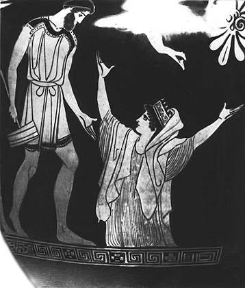 «Пандора и Эпиметей». Фрагмент росписи краснофигурного кратера. 450-440 до н. э. Музей Ашмола. Оксфорд.