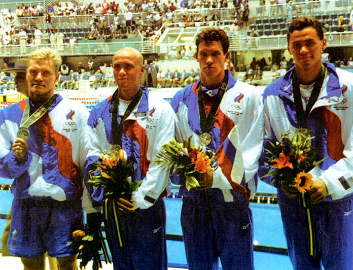Серебряные олимпийские призеры в комбинированной эстафете 4х100 м (Д. Панкратов, В. Сельков, С. Лопухов и А. Попов). Атланта. 1996.