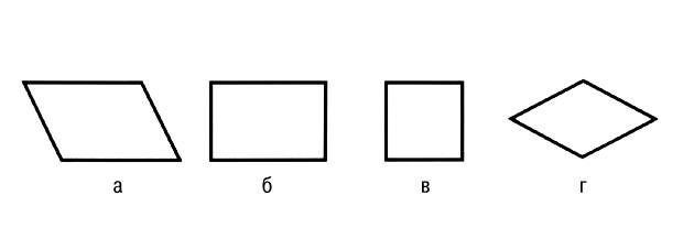 Параллелограммы: а — общего вида, б — прямоугольный, в — квадрат, г — ромб.