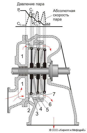 Схематический продольный разрез активной турбины с тремя ступенями давления: 1 — кольцевая камера свежего пара; 2 — сопла первой ступени; 3 — рабочие лопатки первой ступени; 4 — сопла второй ступени; 5 — рабочие лопатки второй ступени; 6 — сопла третьей ступени; 7 — рабочие лопатки третьей ступени.