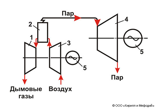 Схема парогазотурбинной установки с высоконапорным парогенератором: 1 — газовая турбина; 2 — высоконапорный парогенератор; 3 — компрессор; 4 — паровая турбина; 5 — электрический генератор.