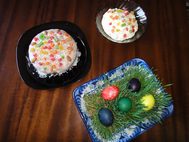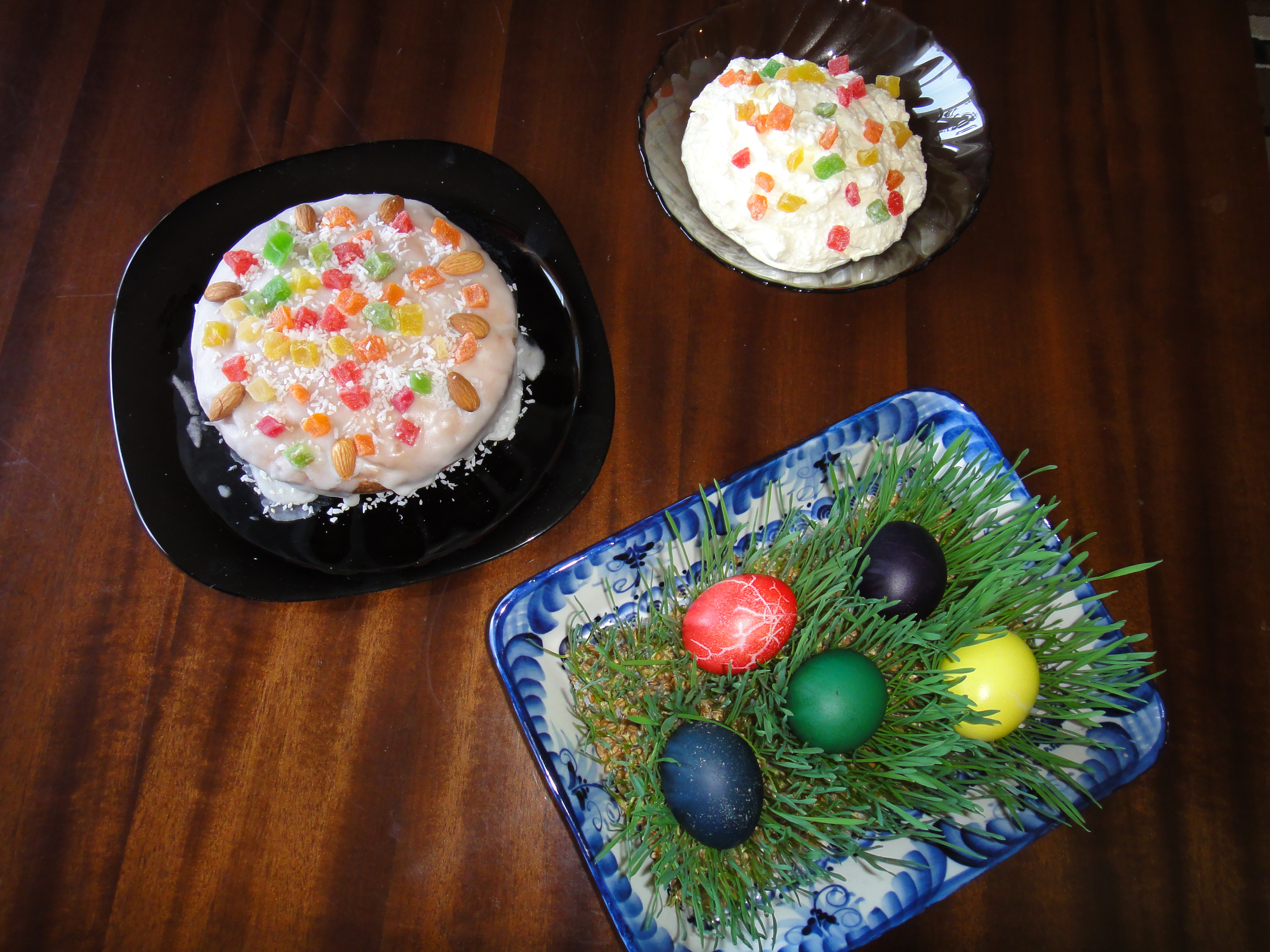 Пасхальные символы. Кулич, творожная пасха, крашеные яйца.