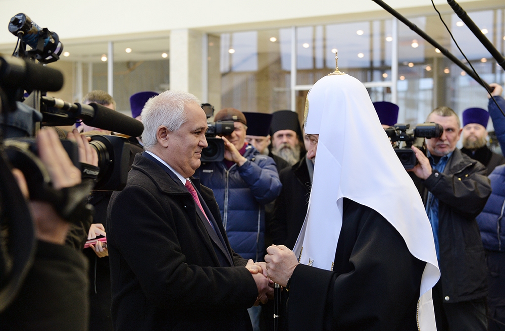 Патриарх Московский и всея Руси Кирилл и Чрезвычайный и Полномочный посол Республики Куба в Российской Федерации Эмилио Лосада Гарсия во время прощания перед вылетом Патриарха на Кубу. Фото пресс-службы Патриарха Московского и всея Руси.