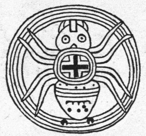 Паук, изображенный на амулете американских индейцев, защищает от опасностей, проистекающих от воды: дождя и другой непогоды, которая могла бы повредить паутину и паука (диск из раковины)