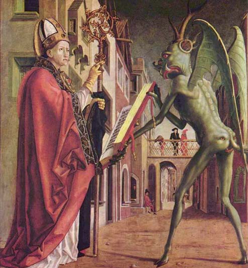 Михаэль Пахер. Святой Вольфганг и черт. Низ внешней стороны правой створки алтаря отцов церкви. 1483 год. Дерево. Старая Пинакотека, Мюнхен.
