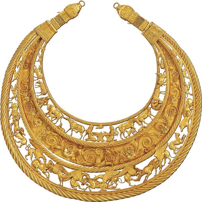 Скифская золотая пектораль из кургана Толстая Могила в Днепропетровской области. 4 век до н.э. Музей исторических драгоценностей Украины, Киев. Пектораль была обнаружена в 1971 году археологической экспедицией под руководством Б.Н. Мозолевского.