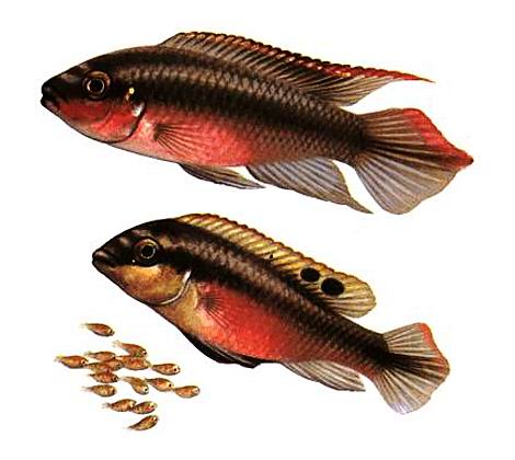 Пельматохромис крибенсис. Вверху самец, внизу самка и мальки.