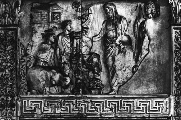 «Эней приносит жертвы в святилище пенатов». Фрагмент рельефа «Алтаря мира». 13-9 до н. э. Рим.