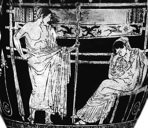«Пенелопа и ее сын Телемах». Фрагмент росписи краснофигурного скифоса. Около 440 до н. э. Археологический музей. Кьюси. Италия.