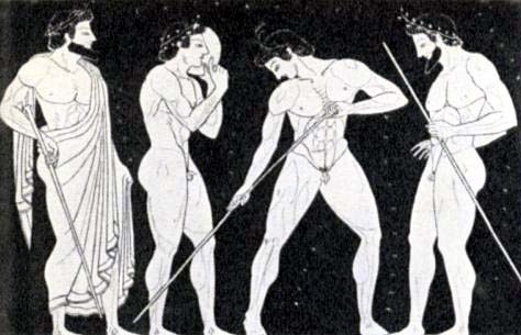 Юноши с копьями. Рисунок на краснофигурной амфоре Финтия. 510-500 до н. э. Париж.
