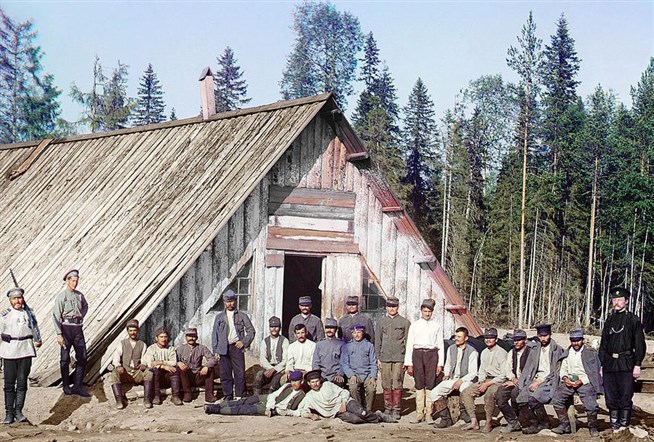 Первая мировая война. Карелия. Плененные солдаты австро-венгерской армии у барака. Строительство Мурманской железной дороги. 1915 год. Фотография С.М. Прокудина-Горского.
