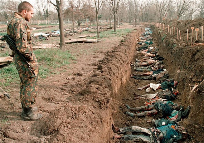 Первая чеченская война. Перезахоронение мирных жителей Грозного, собранных после зимы, на русском кладбище города. Март 1995 года. Снимок А.Е. Неменова.