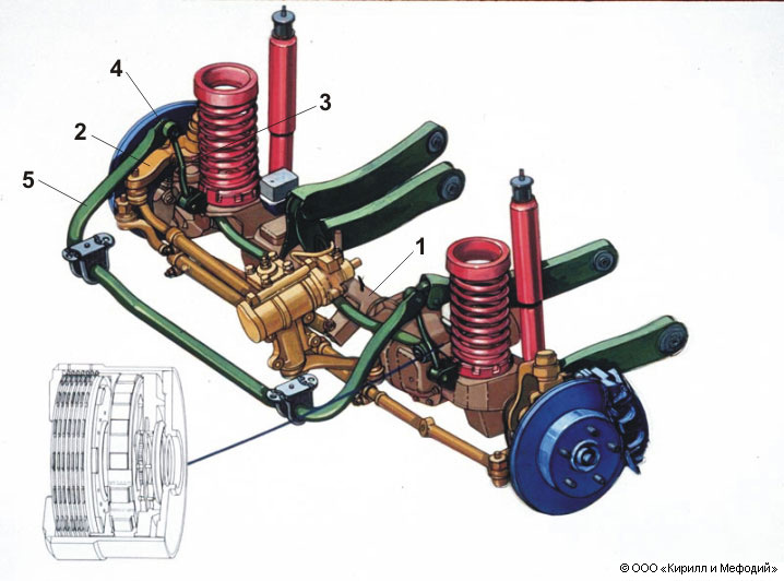 Передний мост с независимой подвеской: 1 — несущая поперечина; 2 и 3 — качающиеся рычаги; 4 — опора пружины; 5 — опора крепления стабилизатора поперечной устойчивости.