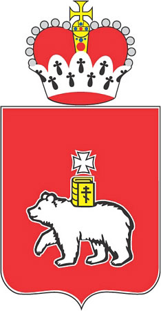 Герб Пермской области был принят 28 декабря 1995 года. На червленом (красном) геральдическом щите — серебряный медведь; на его спине Евангелие в золотом окладе с изображением восьмиконечного креста. Евангелие увенчано серебряным уширенным, вогнутым на концах крестом. Щит увенчан княжеской короной. Герб также имел за щитом венок перевитый андреевской лентой, но это украшения было удалено с герба 22 августа 1996 года.