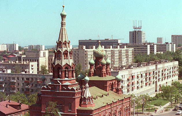 Пермь. Центральная часть города. На переднем плане Феодосьевская церковь (другое название — церковь Вознесения).