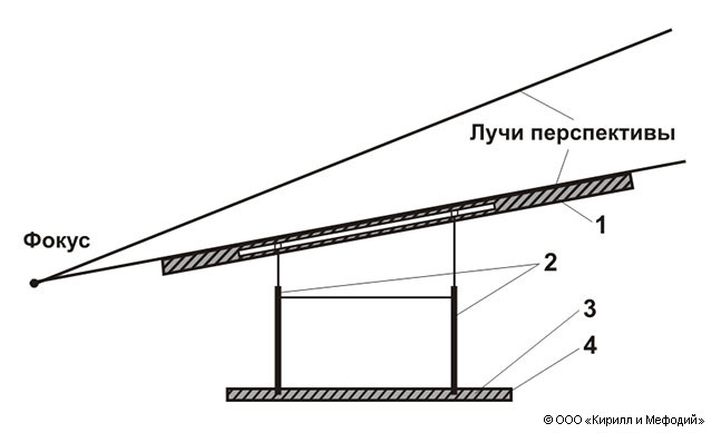 Перспектограф: 1 — линейка; 2 — выдвижные стойки; 3 — линейка-основание; 4 — иглодержатели.