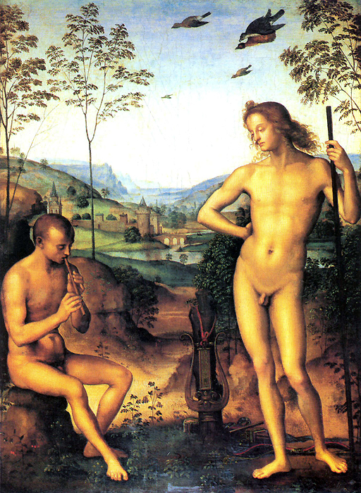 Пьетро Перуджино. Аполлон и Марсий. 1480-е годы. Дерево. Лувр. Сатир Марсий подобрал флейту, брошенную богиней Афиной, и достиг в игре на ней совершенства. Возгордившись, он бросил вызов самому Аполлону. Приняв вызов, Аполлон одержал победу над Марсием и сорвал с дерзкого кожу.
