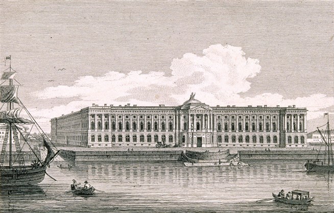 Петербургская академия художеств. Гравюра по рисунку П. Свиньина. Здание академии построено по проекту архитекторов Ж.Б. Валлен-Деламота и А.Ф. Кокоринова в 1788 году.