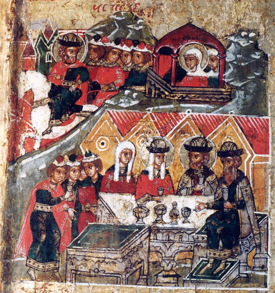Петр увозит Февронию в Муром. Пир с князем Павлом и его супругой. Клеймо иконы Муромских святых князя Константина со чадами Михаилом и Феодором, Петра и Февронии и Иулиании Лазаревской с житием Петра и Февронии. XVII век. Фото: pravoslavie.ru