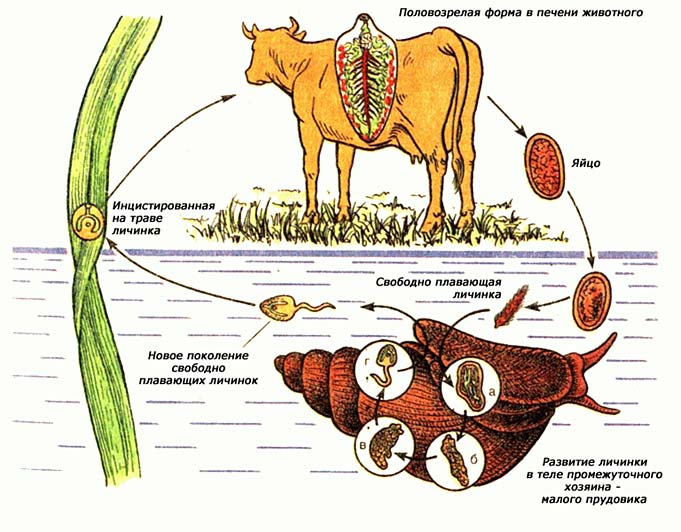 Для печеночного сосальщика характерно развитие с метаморфозом, смена хозяев и чередование поколений. Крупный рогатый скот и человек являются основными, а малый прудовик - промежуточным хозяином.