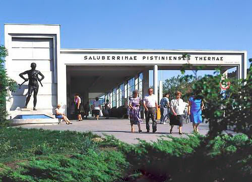 Пиештяны. У входа в термы установлена знаменитая статуя мужчины, ломающего костыль.