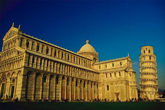 Соборный комплекс. Пиза. «Падающая башня» (отклонение от вертикальной линии на 4, 5 м) и Пизанский собор являются одним из лучших архитектурных ансамблей романского стиля. Пизанский собор представляет собой грандиозную и простую в плане базилику. Шесть ярусов декоративных аркад покрывают беломраморную «Падающую башню», получившую свое название из-за сильного наклона.