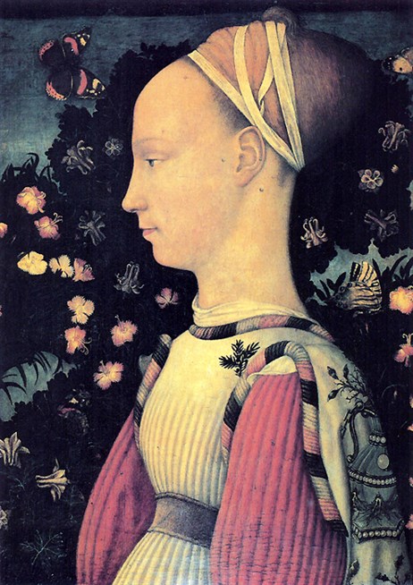 Антонио Пизанелло. Портрет Джиневры д`Эсте. 1435-1440 годы. Масло, дерево. Лувр, Париж. Портрет написан на фоне цветущего куста в окружении бабочек, которые являются символами преходящей земной красоты и недолгой жизни.