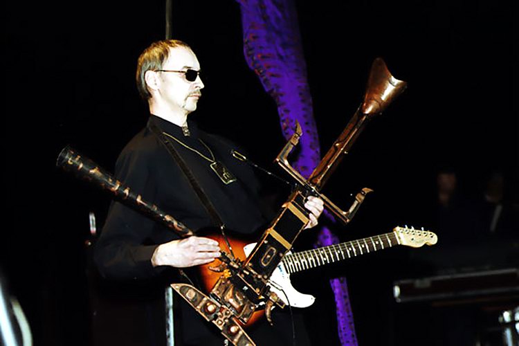 Эдмунд Шклярский играет на «новоегипетском инструменте», на заднем плане пиротехнический знак.