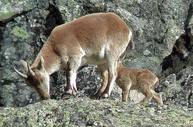 Самка пиренейского горного козла с детенышем.