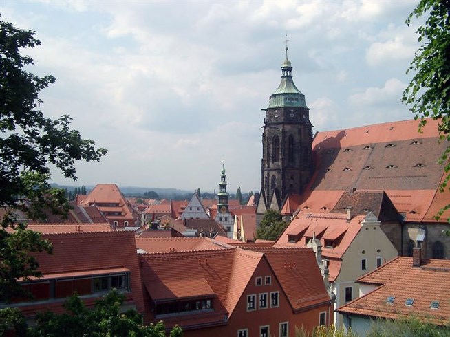 Пирна. Панорама города. Справа — церковь Мариенкирхе. 1502-1546.
