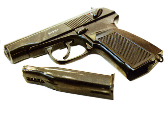Пистолет ПММ (модернизированный пистолет Макарова, Россия, 1994 год). От прототипа ПММ внешне отличается увеличенной пластиковой рукояткой более удобной формы. Но главным отличием является использование нового, усиленного (высокоимпульсного) патрона 9х18 ПМ-М (57Н181СМ). ПММ может комплектоваться однорядным магазином на 8 патронов или двухрядным на 12 патронов.