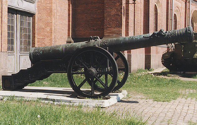 40-гривенная пищаль «Лев» (Россия). Ствол отлит в 1590 году. Лафет декоративный.