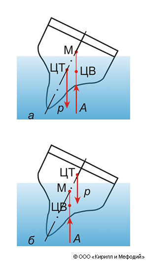 Положение метацентра М при устойчивом (а) и неустойчивом (б) равновесии плавающего тела: ЦТ — центр тяжести плавающего тела; ЦВ — центр водоизмещения; Р — сила тяжести, действующая на плавающее тело; А — подъемная (выталкивающая) сила.
