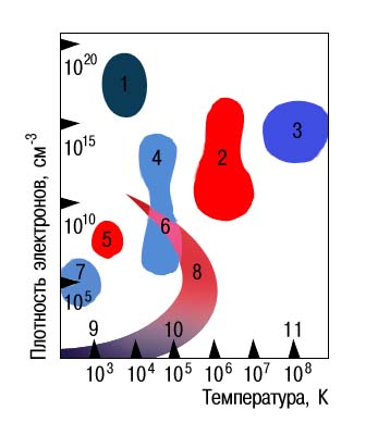 Некоторые состояния плазмы: 1 — разряд при высоком давлении; 2 — эксперименты по синтезу ядер; 3 — термоядерные реакторы; 4 — разряд при низком давлении; 5 — пламя; 6 — тлеющий разряд; 7 — ионосфера; 8 — солнечная корона; 9 — межзвездное пространство; 10 — межпланетное пространство; 11 — центр Солнца.