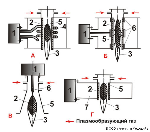 Схемы высокочастотных плазмотронов: а — индукционный; б — емкостный; в — факельный; г — сверхвысокочастотный; 1 — источник электропитания; 2 — разряд; 3 — плазменная струя; 4 — индуктор; 5 — разрядная камера; 6 — электрод; 7 — волновод.