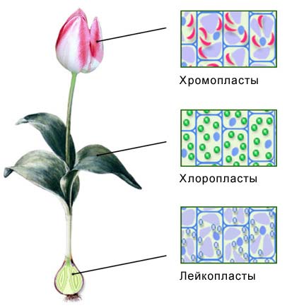 В зависимости от типа пластид органы растений имеют разную окраску: зеленый цвет придают хлоропласты, красный и желтый цвет зависит от наличия хромопластов, неокрашенные части растений содержат лейкопласты.