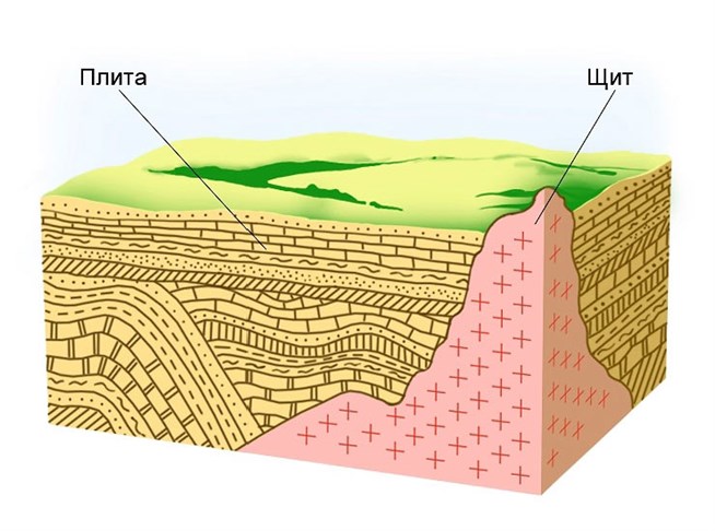 В пределах платформы выделяются щиты и плиты. В районах щитов на поверхность Земли выходят складчатые докембрийские кристаллические породы, слагающие фундамент платформ. Щиты обычно представляют собой приподнятые области земной коры, их очертания отличаются большой устойчивостью в течение длительного времени. В районах плит складчатое основание относительно погружено и покрыто толщей горизонтально залегающих или слабонарушенных осадочных пород.