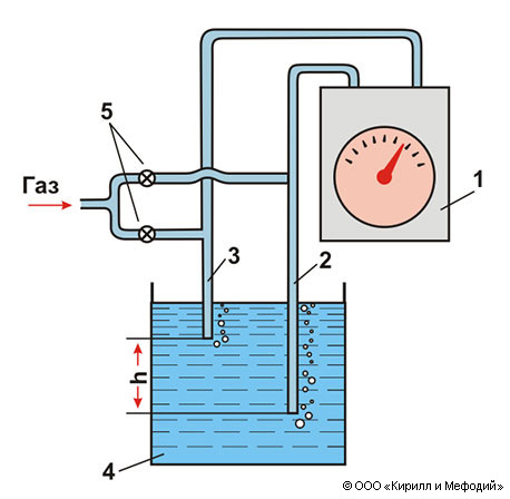 Схема дифференциального гидростатического плотномера с продувкой газа: 1 — дифференциальный манометр; 2 — длинная трубка; 3 — короткая трубка; 4 — сосуд с исследуемой жидкостью; 5 — вентили.