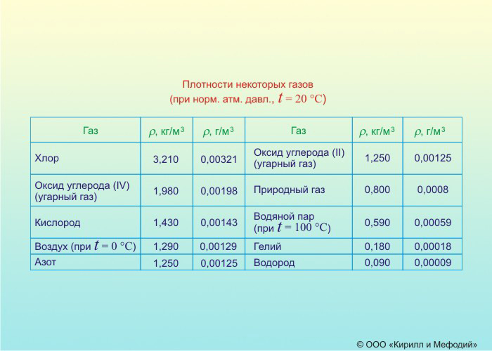 Плотности некоторых газов (таблица)