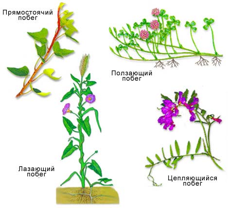У прямостоячего побега стебель растет перпендикулярно поверхности земли, у ползающего - стелется по поверхности почвы. Вьющийся стебель обвивается вокруг опоры, цепляющийся поднимается вверх, держась за опору с помощью усиков.