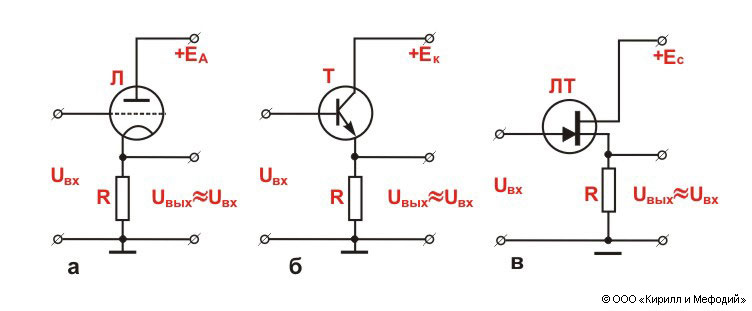 Повторители: а — катодный; б — эмиттерный; в — истоковый; Л — электронная лампа; Т — транзистор; ПТ — полевой транзистор; R — нагрузочный резистор; Uвх — напряжение входного сигнала; Uвых — напряжение выходного сигнала; Еа, Ek, Ec — постоянные напряжения, подаваемые соответственно на анод, коллектор и сток.