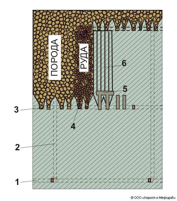 Система подэтажного обрушения с доставкой руды самоходными машинами (т. н. шведский вариант): 1 — подэтажный штрек; 2 — подэтажные орты; 3 — рудоспуск; 4 — погрузочно-доставочные агрегаты; 5 — буровые каретки; 6 — проходческие буровые каретки.