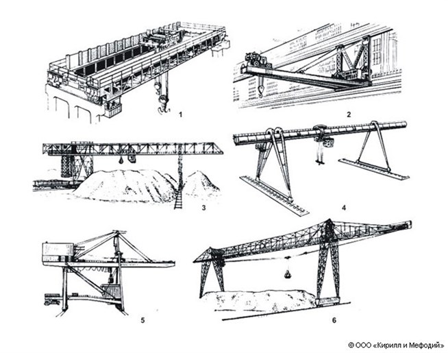 Неповоротные краны: 1 — мостовой; 2 — настенно-консольный; 3 — мостовой перегружатель; 4 — козловой; 5 — береговой консольный перегружатель; 6 — мосто-кабельный кран.