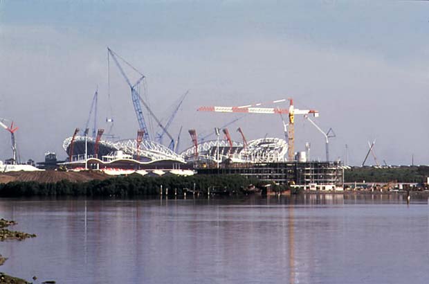 Различные типы подъемных кранов на строительстве Олимпийского стадиона в Сиднее.