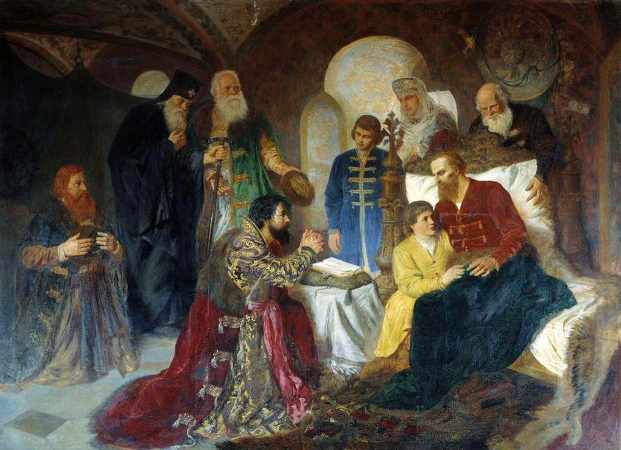 Вильгельм Александрович Котарбинский (1849-1921). Больной князь Дмитрий Пожарский принимает московских послов. 1882 год. Холст, масло. Омский музей изобразительных искусств.