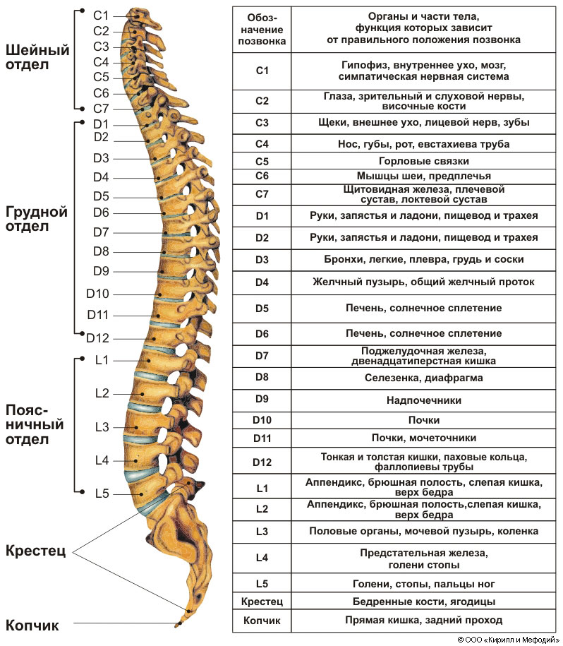 Схема строения позвоночника человека. Значение правильного положения отдельных позвонков для нормального функционирования внутренних органов.