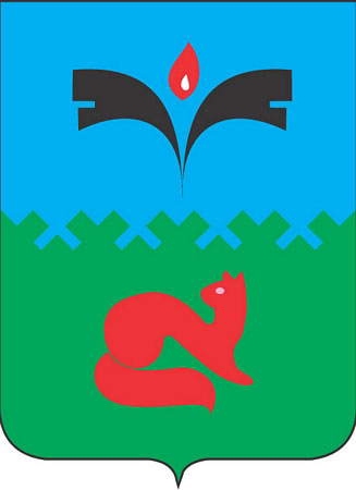 Герб города Покачи. Вверху в лазоревом поле — черный фонтан под червленым пламенем. Внизу в зеленом поле — красный соболь.