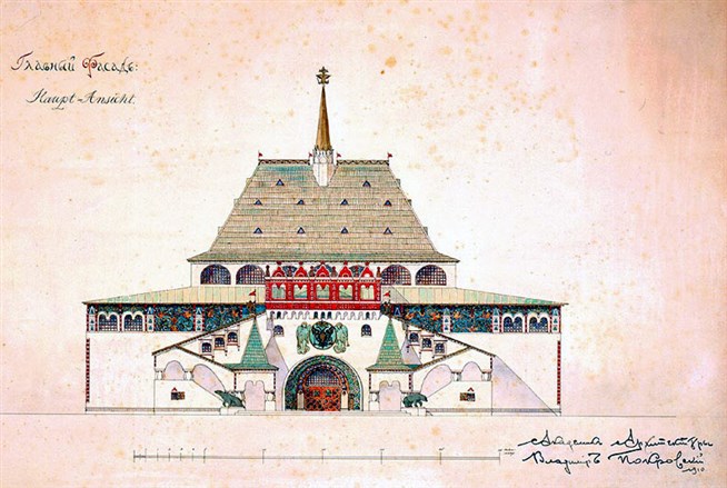 Эскиз русского павильона на Международной выставке санитарии и гигиены в Дрездене, 1910. Архитектор В. А. Покровский.