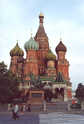 Покровский собор (храм Василия Блаженного). Вид со стороны Красной площади. Перед храмом — памятник Минину и Пожарскому (1804-1818). Скульптор И. П. Мартос.